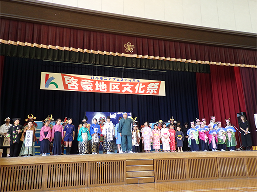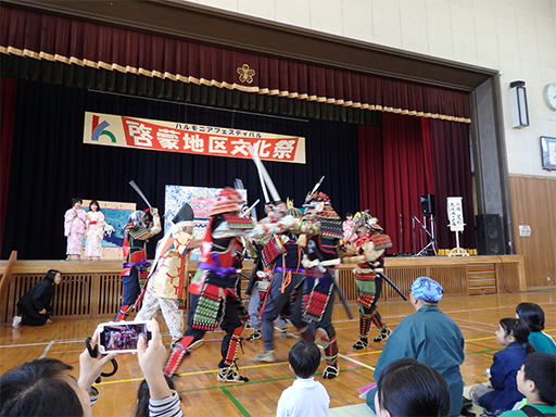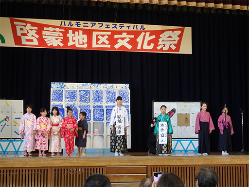 福井学(子ども劇「啓蒙キッズ」)では、啓蒙地区を流れる芝原用水の掘削を命じた福井藩主、結城秀康の偉業と人物像を学ぶことで郷土に興味を持ってもらい、その結城秀康の生きざまを地区の子どもたちに実演させることで、地区行事の新興につなげ、地区への愛着を深めてもらっています。