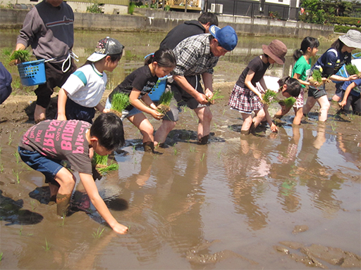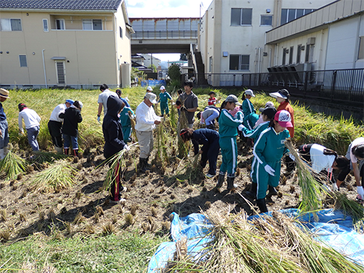 ~豊作くん~地区の団体(育成会)と協力して、田植えから収穫まで、みんなで力を合わせて農業体験しています!